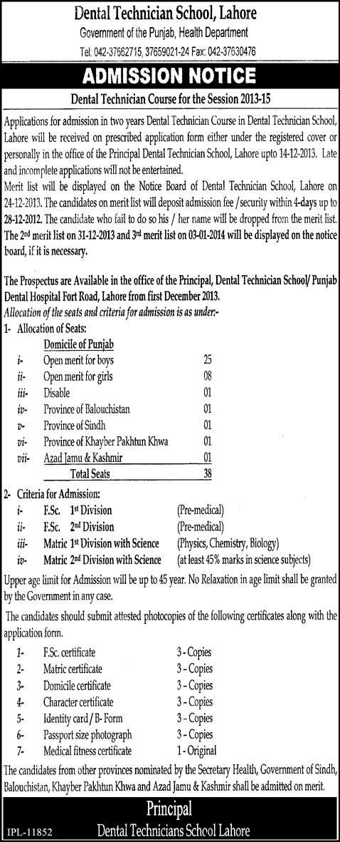 Dental Technician School , Lahore has announced admission for the Session 2013-2015.